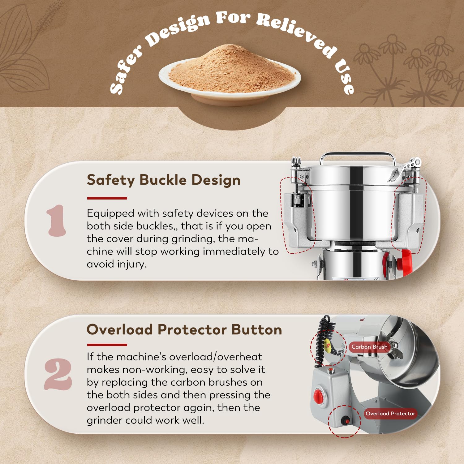 - Safer Design For Relieved Use - Our electric grinder is equipped with a safety buckle device on the both sides of lid, that is if you open the lid during grinding, the machine will stop working immediately to avoid injury. And with upgraded overload protector, the grinder will also stop working to prevent the motor from burning-out when in overload/overheat state.